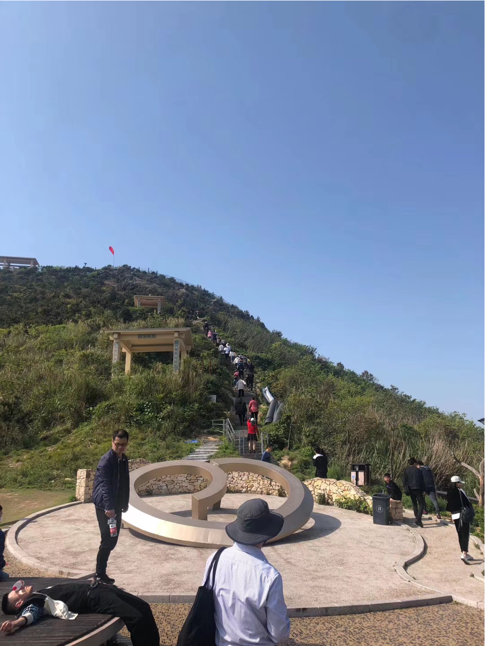 一個一個緊緊跟隨著,充滿著激情,一步一往上攀登,最終抵達綠道至高點:網紅觀景臺,并在這里留下勝利的笑影。海風陣陣,吹干了路程中留下的汗水。站在最高點上放眼望去,著實有“一覽眾山小”的感覺。這讓大家感觸到,只有奮勇攀登,堅持到底,才可一覽無限風光!